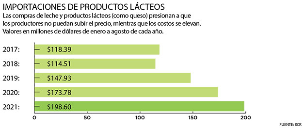 Los datos del Banco Central de Reserva (BCR) confirman que las importaciones de leche y productos lácteos aumentan cada año, y solo entre enero y agosto de 2021 representaron $198.6 millones, equivalente a un 14.2 % de incremento interanual contra los $173.7 millones reportados en el mismo período de 2020.