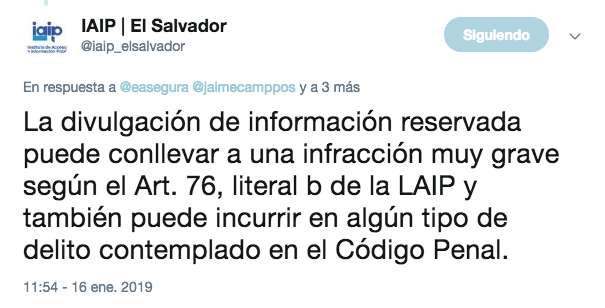 El IAIP aseguró en Twitter que confirmó la reserva de la información en el proceso 264-A-2015 y señaló que la divulgación de información reservada es una infracción muy grave.