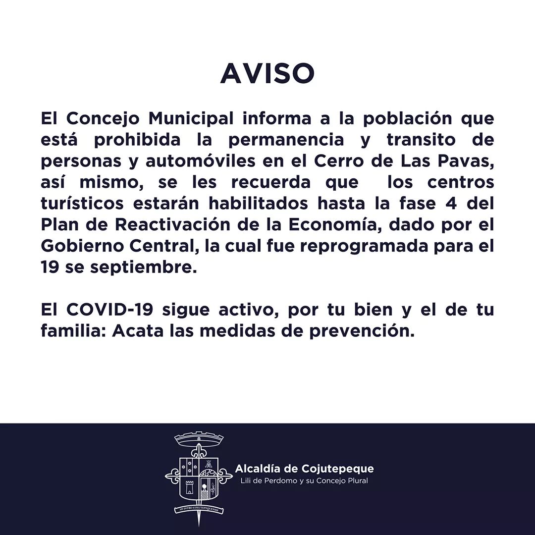 La Comisión Municipal de Protección Civil ordenó este martes cerrar el Cerro Las Pavas ubicado en el centro de Cojutepeque, en el departamento de Cuscatlán, como medida preventiva ante la pandemia del covid 19.