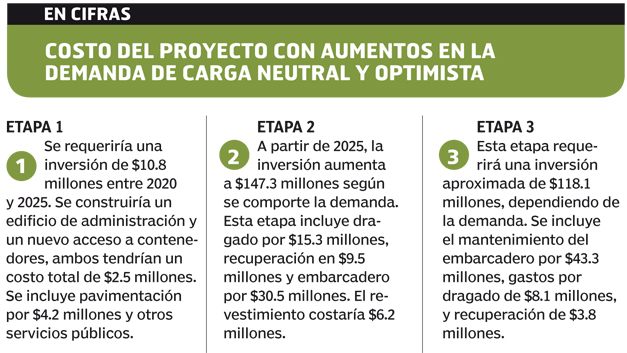 El director del proyecto detalló que la primera etapa sería para 2020 y consiste en operar los muelles en el formato existente. Recomendó considerar la opción de incrementar la cantidad de carga de transporte con la adopción de una grúa móvil.