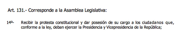 El artículo 131 de la Constitución de la República, en su numeral 14, obliga a la Asamblea Legislativa a recibir la protesta del Presidente y del Vicepresidente de la República: