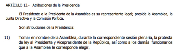 El reglamento interior de la Asamblea Legislativa indica que su presidente hace la toma de protesta como representante legal del poder legislativo: