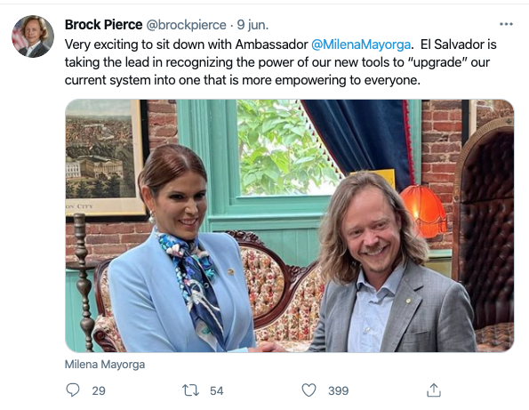 Publicación del 9 de junio en la cuenta de Brock Pierce sobre una reunión con la embajadora de El Salvador en Estados Unidos, Milena Mayorga.