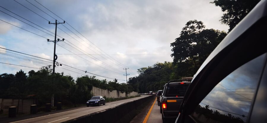 Los gestores de tránsito poco logran aliviar la desesperación de decenas de conductores y pasajeros parados en las cargadas unidades de transporte público que quedaron atascados en la calle que conduce del Puerto de La Libertad a San Salvador.