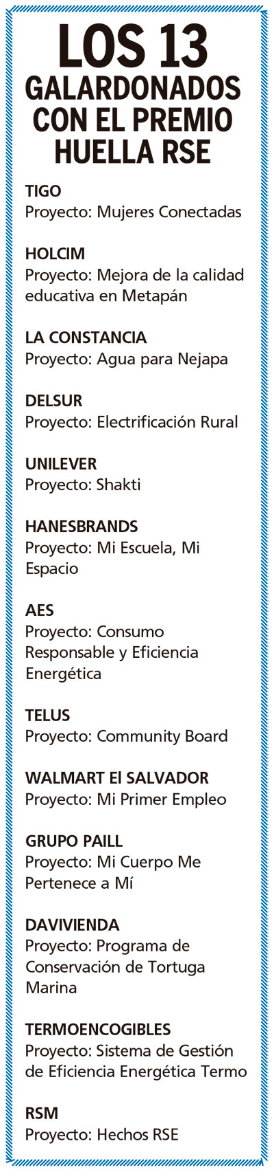 Los proyectos reconocidos fueron Mujeres Conectadas, de Tigo El Salvador, que busca cerrar la brecha digital entre hombres y mujeres; el proyecto ejecutado por Holcim para mejorar la calidad educativa en Metapán; también se premió a Agua para Nejapa, de La Constancia, y al proyecto de electrificación rural de la distribuidora de energía DELSUR.