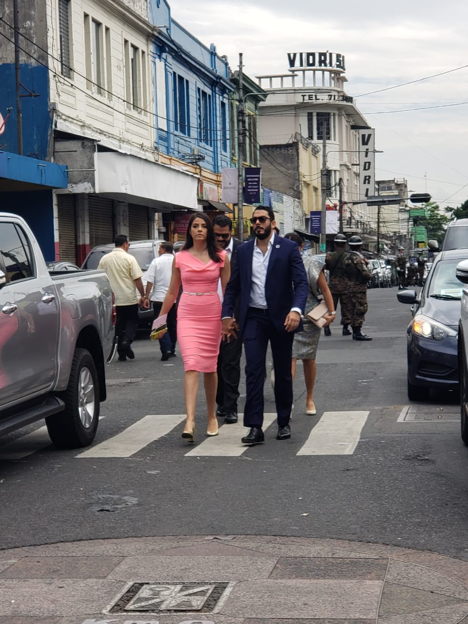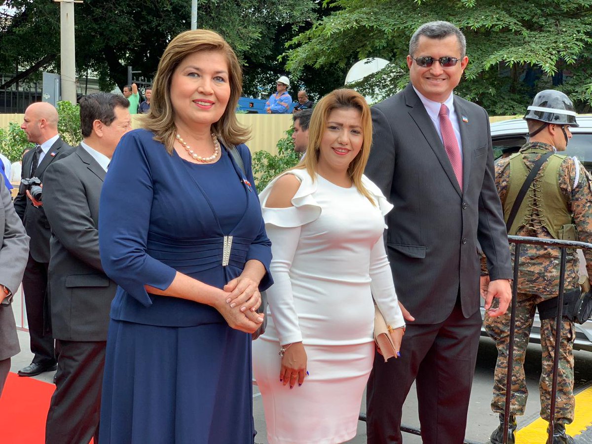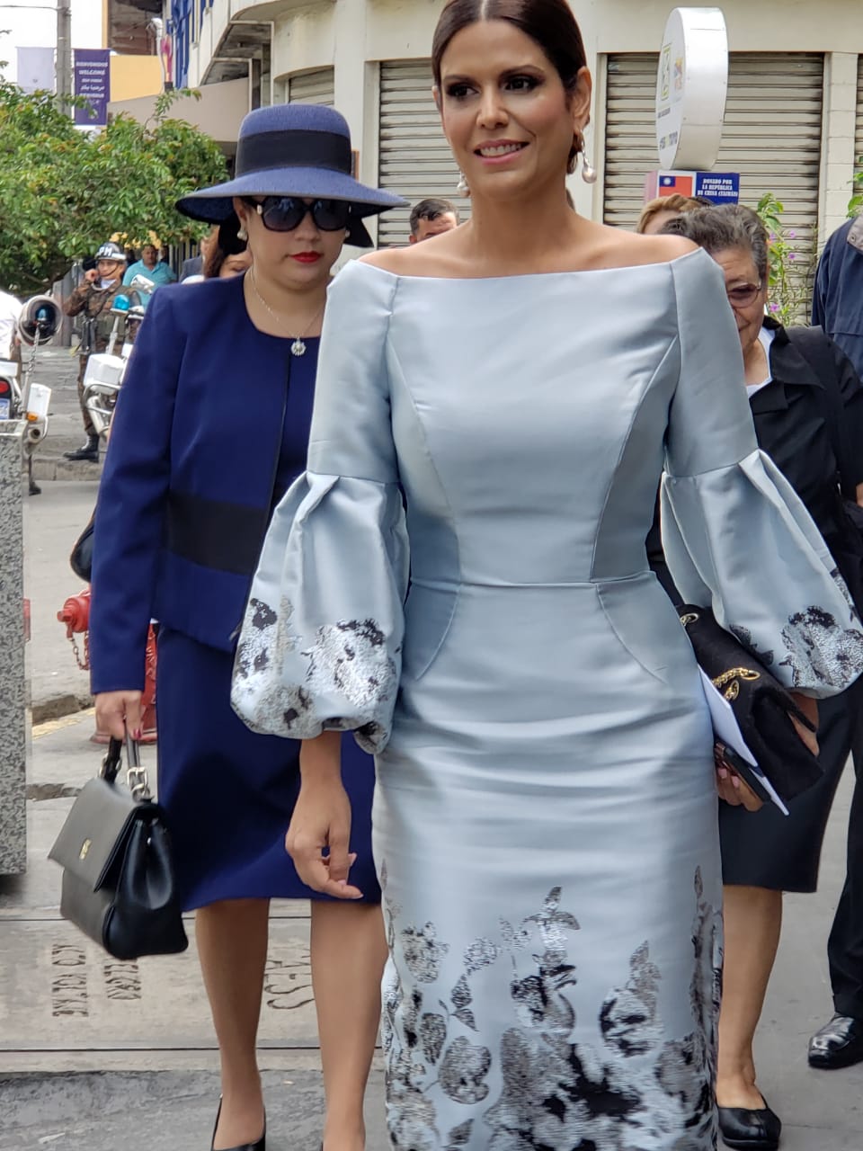 La gran protagonista fue la primera Dama, Gabriela de Bukele quien utilizó un elegante vestido de corte clásico, muy adecuado y cómodo para su estado de embarazo: “El escote utilizado fue en un corte V pronunciado y abierto en la parte de los hombros, en la tendencia off shoulders que le favoreció mucho por su figura y además le proporcionó comodidad ante el calor. Utilizó un bello color azul bandera, que le va muy bien con su color de piel y contrasta maravillosamente con su cabellera oscura. Los accesorios utilizados fueron de estilo sencillo, permitiendo realzar su belleza. El cabello en ondas suaves y el maquillaje que la hicieron ver fresca.