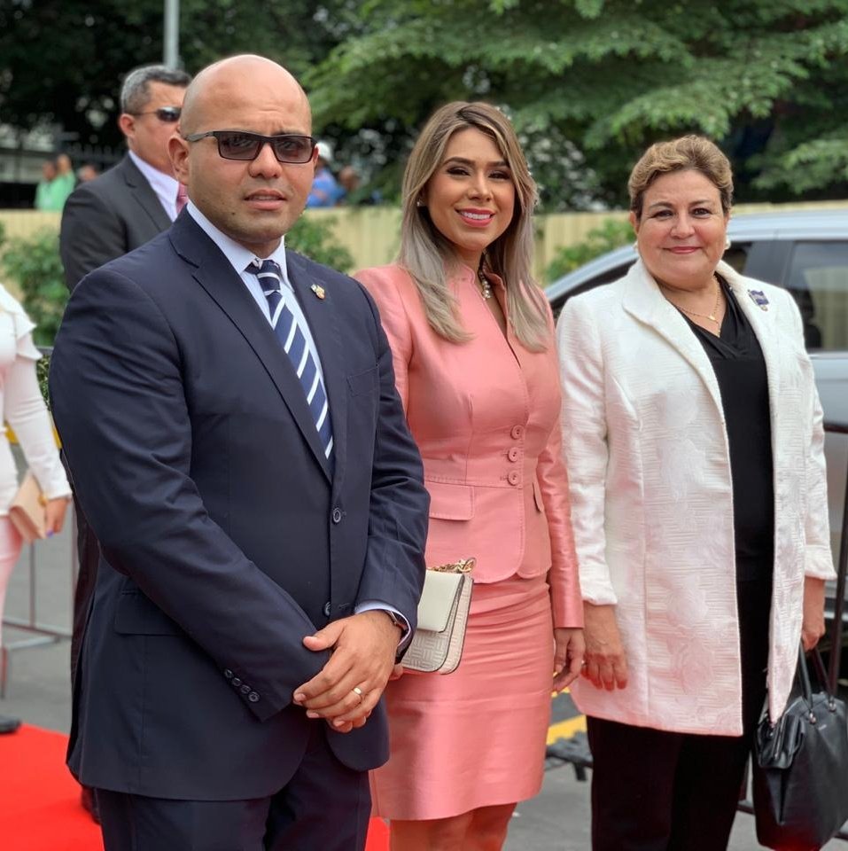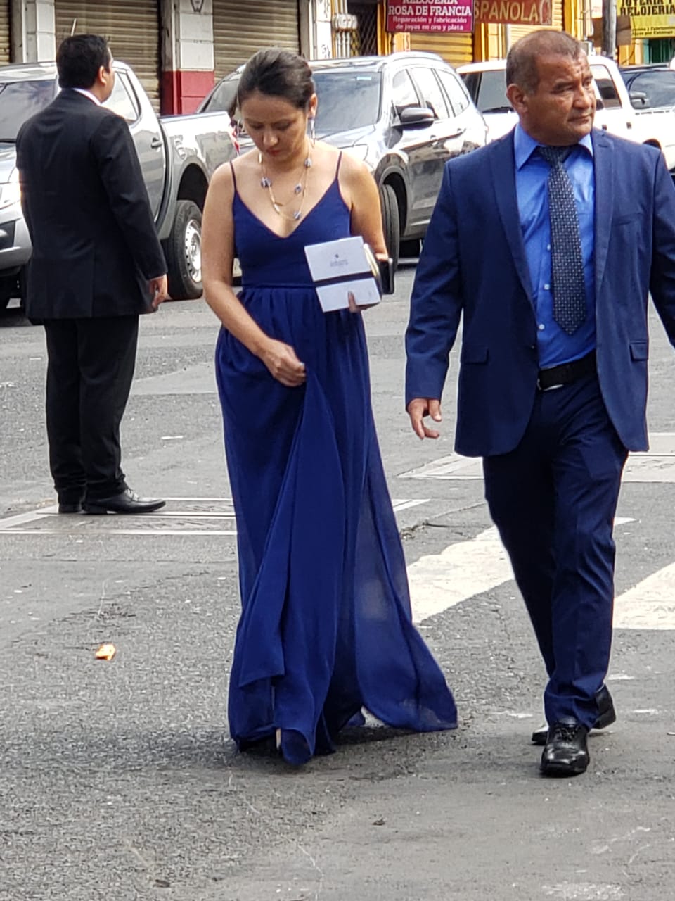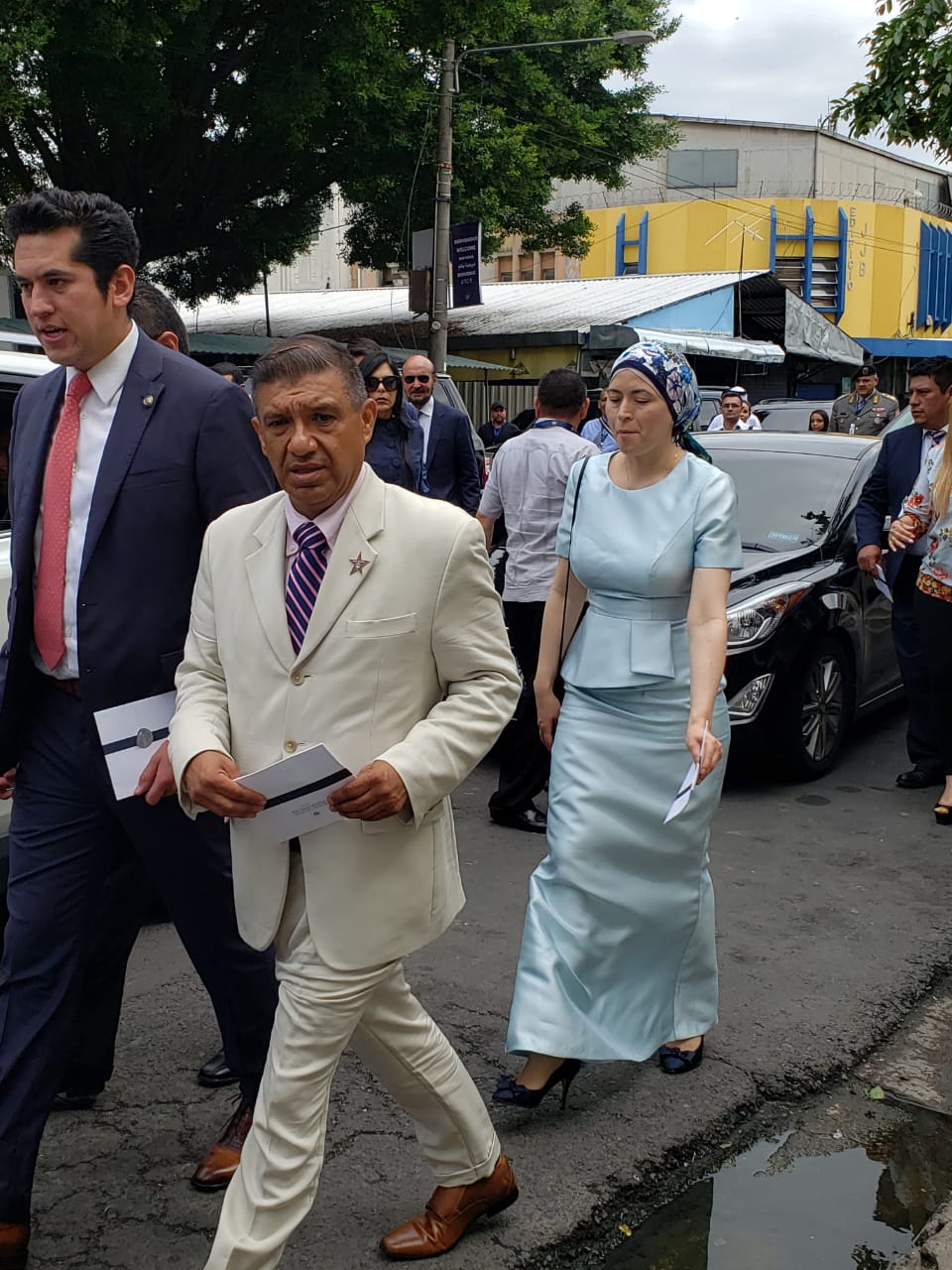 La gran protagonista fue la primera Dama, Gabriela de Bukele quien utilizó un elegante vestido de corte clásico, muy adecuado y cómodo para su estado de embarazo: “El escote utilizado fue en un corte V pronunciado y abierto en la parte de los hombros, en la tendencia off shoulders que le favoreció mucho por su figura y además le proporcionó comodidad ante el calor. Utilizó un bello color azul bandera, que le va muy bien con su color de piel y contrasta maravillosamente con su cabellera oscura. Los accesorios utilizados fueron de estilo sencillo, permitiendo realzar su belleza. El cabello en ondas suaves y el maquillaje que la hicieron ver fresca.