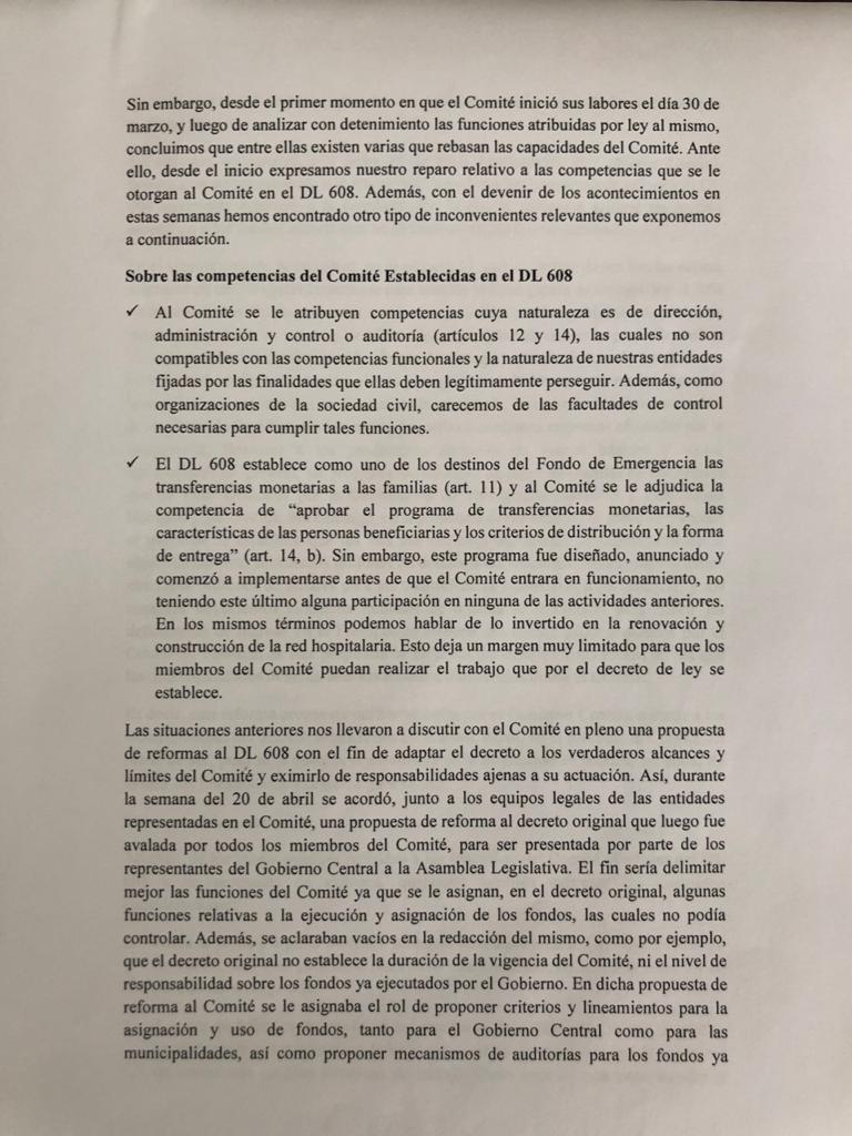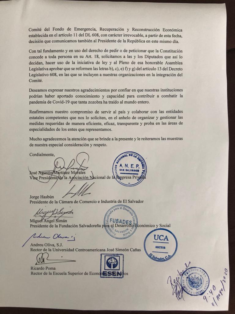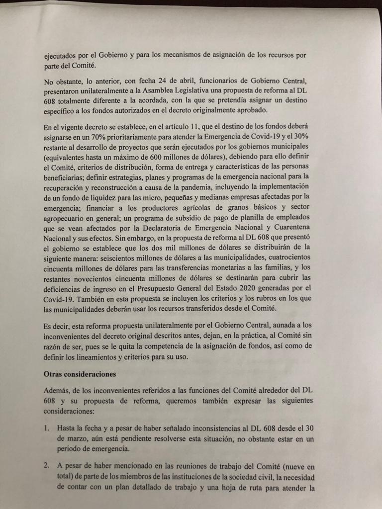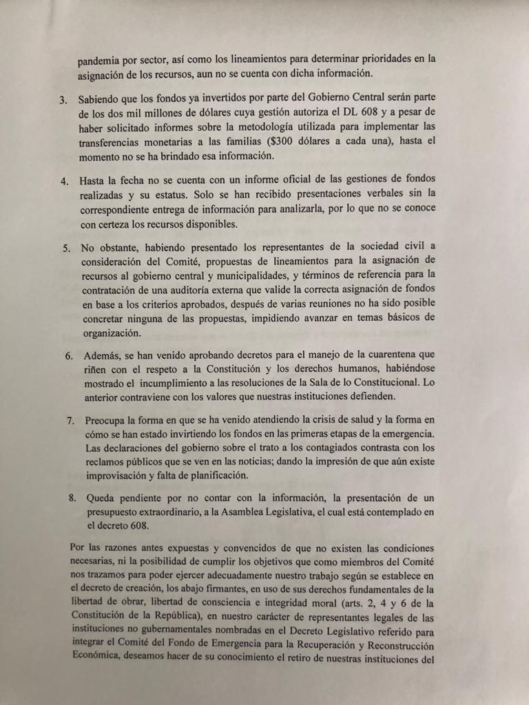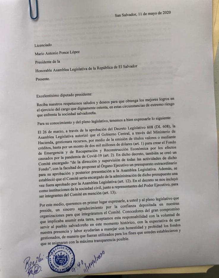 Los titulares de las instituciones representadas en el Comité presentaron una carta dirigida al presidente de la Asamblea Legislativa, Mario Ponce, con copia al presidente de la República, Nayib Bukele. En la misiva, dijeron, se retiran "de manera irrevocable".