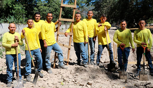 Seleccionados por su buen comportamiento, el grupo de internos trabaja con habitantes de la comunidad El Espino en la construcción de condominios, en un predio que les concedió el Ministerio de Hacienda, contiguo a la Cancillería, en Antiguo Cuscatlán.