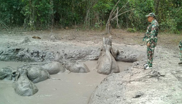 Cuando los guardias forestales se dieron cuenta de que los elefantes, de entre uno y cuatro años, no podían salir del hoyo lleno de barro tomaron medidas: algunos se fueron a buscar herramientas para ayudarlos a salir, mientras otros pasaron toda la noche junto a los atemorizados paquidermos para cuidarlos.