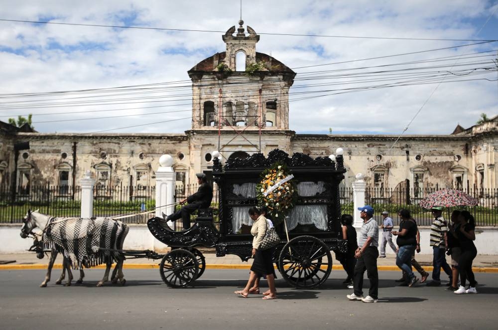 Agotada tras el velatorio en la madrugada, Mariela López encabeza el cortejo detrás de un elegante carruaje negro tirado por caballos rumbo al cementerio de Granada, ciudad colonial de Nicaragua donde ricos y pobres comparten esta tradición que data del siglo XIX.