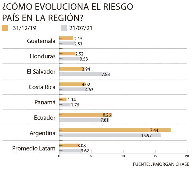 Este miércoles 21 de julio, el riesgo país cerró en 783, dos puntos más que la calificación de Ecuador (781), atizado por las turbulencias que generó la rápida aprobación de Ley Bitcoin en junio.
