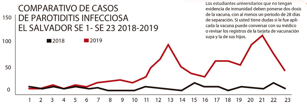 El 8 de abril, la Asociación de Pediatría de El Salvador alertó del aumento de los casos de paperas, a través de un comunicado, y llamó a los padres de familia a prevenir la enfermedad con la aplicación de la vacuna triple viral Sarampión, Rubéola y Paperas (SPR, por sus siglas en inglés); sin embargo, al ser cuestionado por la situación, el entonces viceministro de salud, Julio Robles Ticas, dijo que la situación no era alarmante.