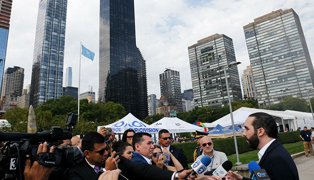 Periodistas salvadoreños junto al gobernante, frente a la sede de las Naciones Unidas, en Nueva York. / DEM