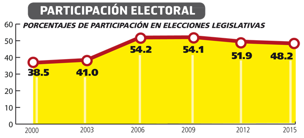 La participación electoral salvadoreña solo ha superado la mitad de los electores en 2006, 2009 y 2012, con 54.2 %, 54.1 % y 51.9 % en las elecciones legislativas; antes de esos años, la participación en este tipo de votación era de 38.5 % y 41 %. En 2015, la tendencia bajó a una participación de 48.2 % y, según un estudio de Álvaro Artiga, politólogo de la Universidad Centroamericana José Simeón Cañas, bajará a 38 %.