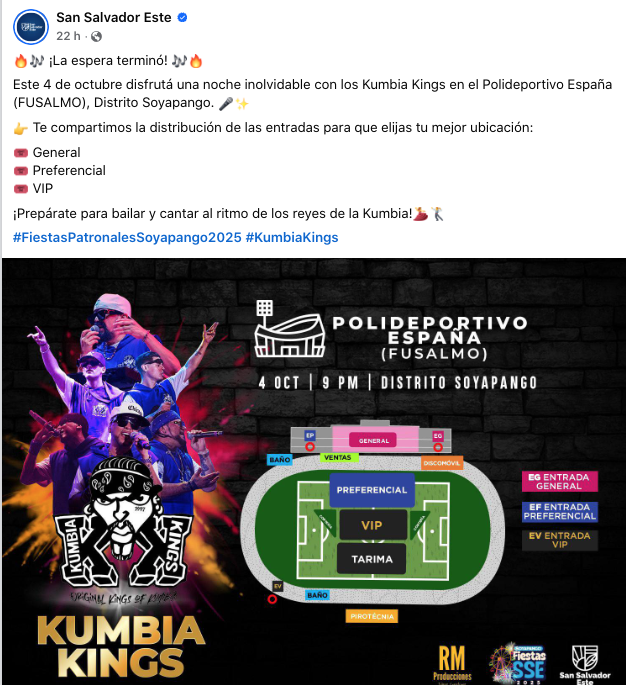 La comuna ha dicho en sus redes que, para obtener una entrada gratuita, los asistentes deben ser habitantes del municipio. Para comprobarlo, deben presentar su Documento Único de Identidad (DUI) en los puntos municipales del distrito de Soyapango, en Paseo Venecia y Plaza Mundo.