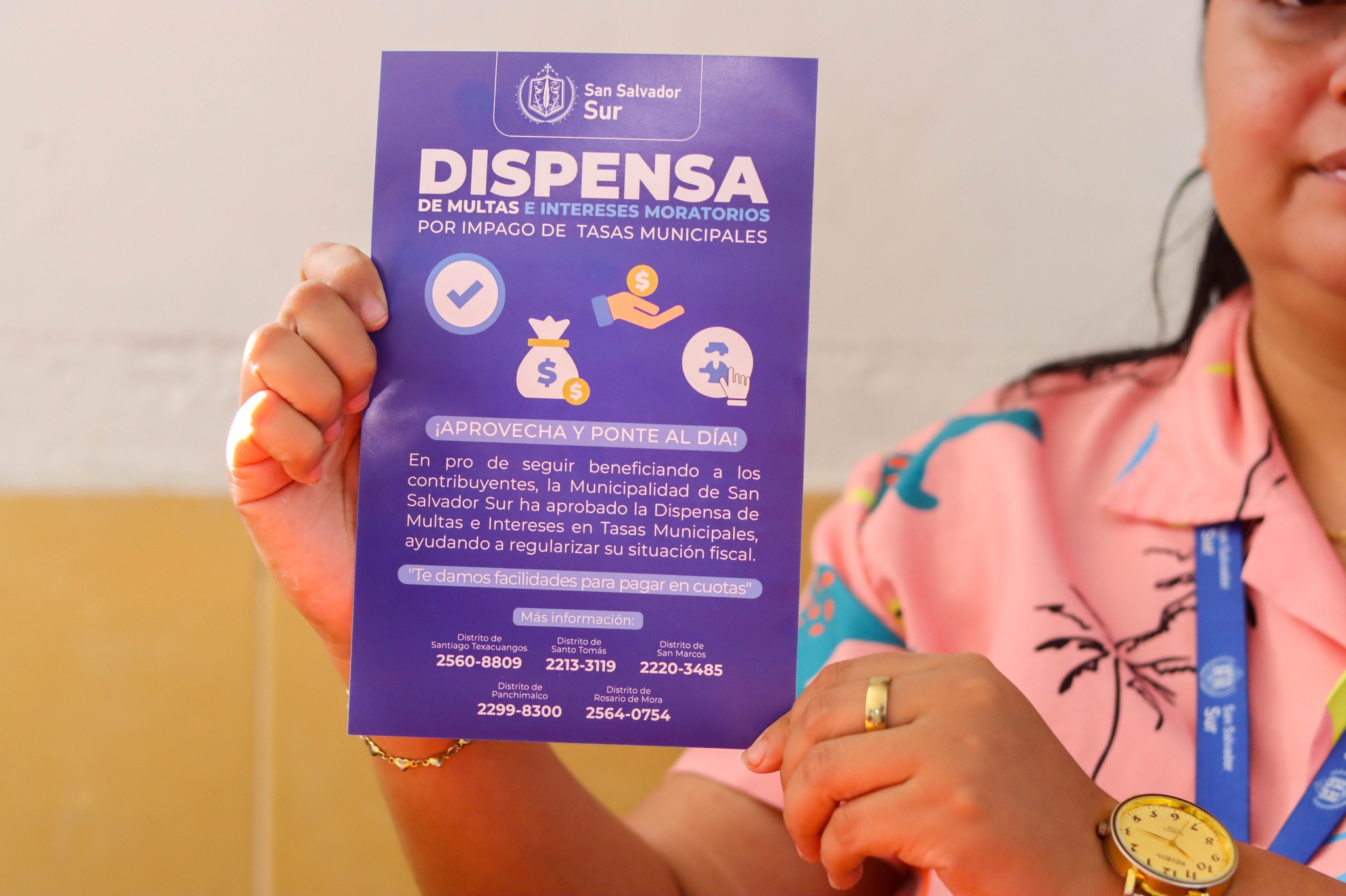 La alcaldía de San Salvador Sur recordó en sus redes sociales que está vigente el decreto municipal para la dispensa de multas e intereses moratorios en los distritos de San Marcos, Santo Tomás, Santiago Texacuangos, Panchimalco y Rosario de Mora.
