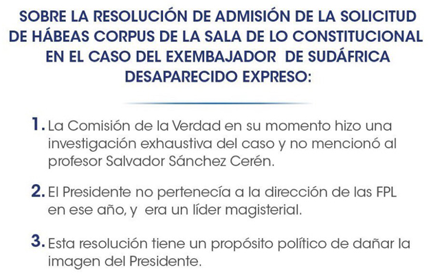 La explicación es firmada por el secretario de comunicaciones, Roberto Lorenzana. El presidente, quien participó yer en la ceremonia de graduación del Vigésimo Séptimo Curso de Seguridad y Desarrollo Nacional, no se pronunció sobre la orden de la Sala de lo Constitucional para que informe dónde se encuentra el cuerpo del exembajador, realizada mediante un habeas corpus, orden que será ejecutada a través de un juez nombrado por la Sala de lo Constitucional, de acuerdo a la Ley Orgánica Judicial.