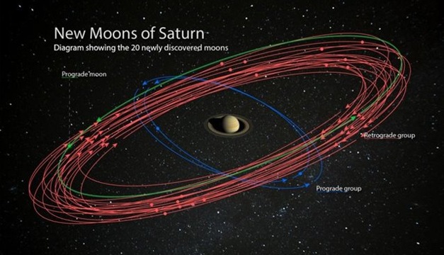 Cada una de las lunas recién descubiertas por un equipo dirigido por Scott S. Sheppard, de Carnegie, tiene unos cinco kilómetros de diámetro. Diecisiete de ellas orbitan el planeta hacia atrás, o en una dirección retrógrada, lo que significa que su movimiento es opuesto a la rotación del planeta alrededor de su eje. Las otras tres lunas orbitan en el progrado, en la misma dirección en que gira Saturno.