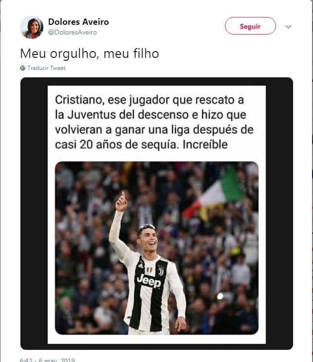 Aveiro no se percató que la información era falsa y se mostró orgullosa de su hijo. "Mi orgullo, mi hijo", escribió la mamá de Ronaldo.