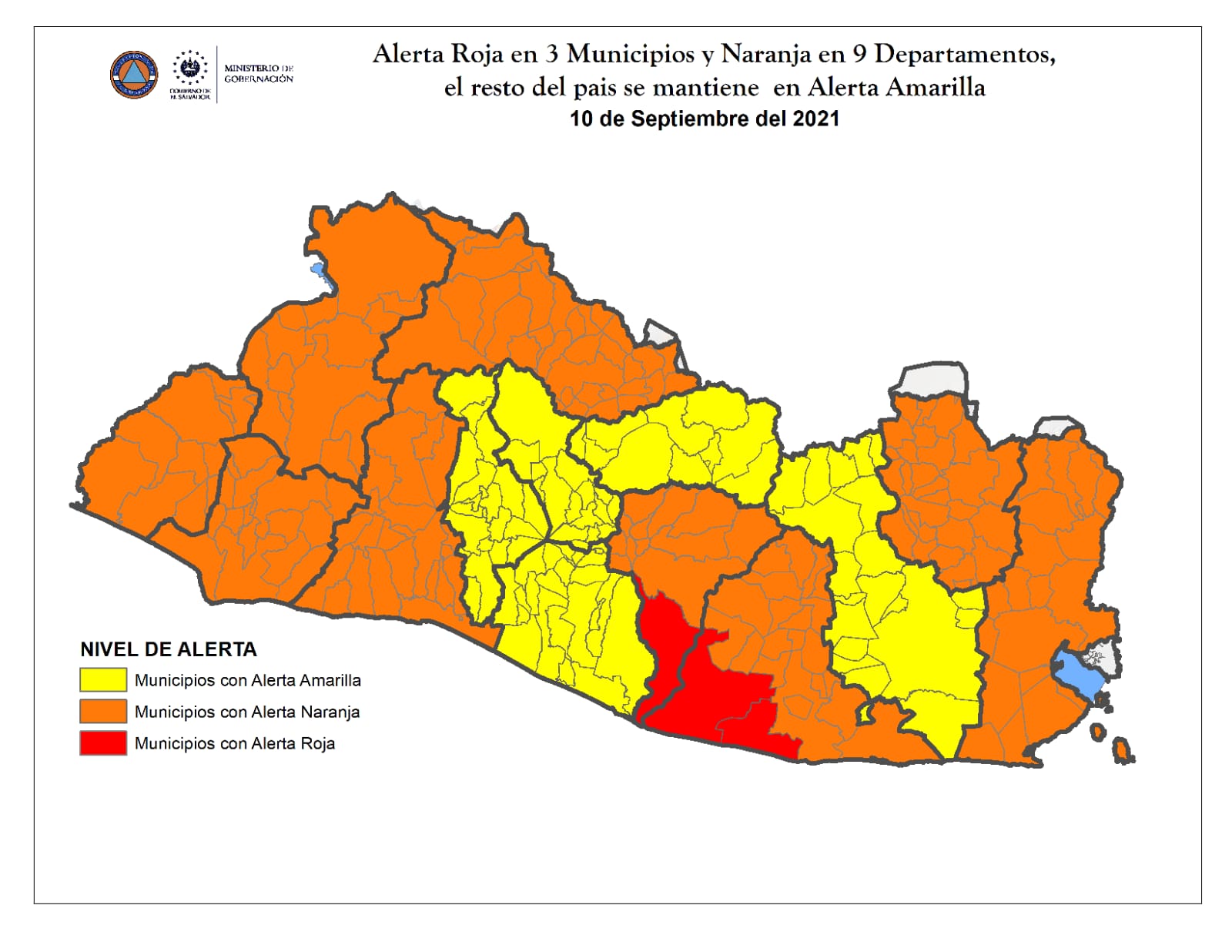 Zonas de alto riesgo: • Jujutla, San Francisco Menéndez, Sonsonate, Acajutla, Santa Isabel Ishuatán, Chiltiupán; Jicalapa, La Libertad, Tamanique, Teotepeque, Zacatecoluca, San Luís Talpa, San Luís la Herradura; San Pedro Masahuat, Santiago Nonualco, Tecoluca, Usulután, Concepción Batres; Jiquilisco, Jucuarán, Puerto El Triunfo, San Dionisio, San Miguel, Chirilagua, El Tránsito; La Unión, Conchagua, Intipucá y Pasaquina.