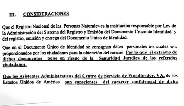 Según fuentes del Registro, el 16 de mayo, la coordinación de DUI en el exterior informó del extravío a Margarita Velado, expresidenta del RNPN.
