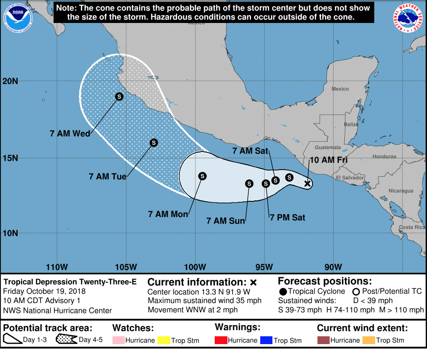 Este es el recorrido que el Centro Nacional de Huracanes prevé para la depresión tropical 23E/ Centro Nacional de Huracanes.