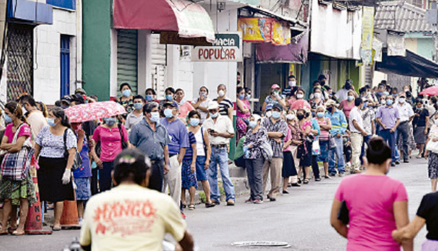 Las largas filas de personas para cobrar el subsidio de $300 prometido por el Gobierno a las familias salvadoreñas para enfrentar la crisis económica causada por el coronavirus, se mantuvieron durante el fin de semana a las afueras de los bancos de los municipios de San Salvador y Soyapango.