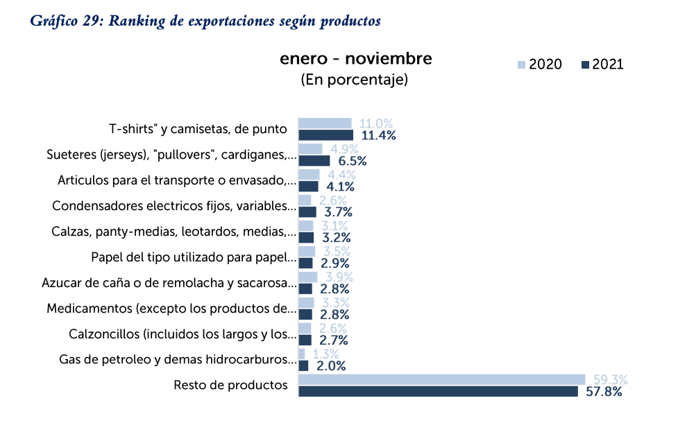 Listado de los productos más exportados por El Salvador entre enero y noviembre de 2021. La industrial textil y confección se mantiene como el principal rubro de la matriz productiva.