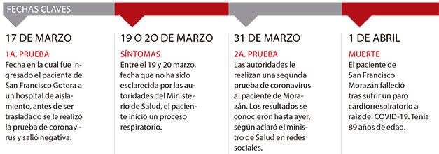 Ayer, en conferencia de prensa, el ministró habló únicamente del segundo deceso. El funcionario dijo que el paciente ingresó el 17 de marzo a uno de los hospitales de aislamiento, previo a su traslado se le realizó la prueba de coronavirus y resultó negativa. Las autoridades sanitarias decidieron mantenerlo hospitalizado, porque presentó un proceso respiratorio dos días después de haber sido trasladado a un nosocomio. Debido al estado del paciente, el 31 de marzo personal del Ministerio de Salud (Minsal) tomó una nueva prueba de laboratorio y resultó positiva para COVID-19.