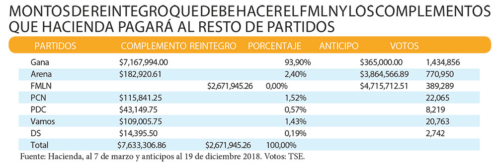 Hasta el pasado 7 de marzo, el fisco aún no había entregado los complementos a los partidos políticos. El que más recibirá será el partido Gran Alianza por la Unidad Nacional (Gana): un total de $7,167,994.00, equivalente al 93.9 % de los complementos aún adeudados por Hacienda.