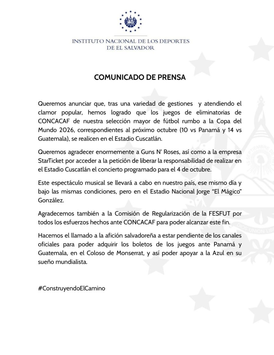 “Queremos anunciar que, tras una variedad de gestiones y atendiendo el clamor popular, hemos logrado que los juegos de eliminatorias de CONCACAF de nuestra selección mayor de fútbol rumbo a la Copa del Mundo 2026, correspondientes al próximo octubre (10 vs Panamá y 14 vs Guatemala), se realicen en el Estadio Cuscatlán”, se lee en el comunicado del funcionario.