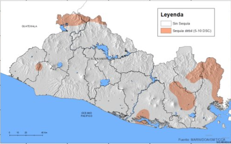 El boletín especial número tres detalla que las zonas donde no ha llovido en 10 días, desde el 14 de julio que inició la canícula, son el norte de Santa Ana y Chalatenango, una zona de Ahuachapán y Sonsonate, el sur de Jiquilisco, el centro este de San Miguel y el norte de La Unión junto al centro de Morazán, según detalla en un mapa.
