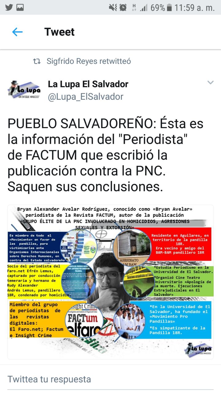 El 25 de agosto, a las 9:55 a.m., la cuenta @sigridoreyes, que presenta al funcionario como "luchador de toda la vida como militante del Frente Farabundo para la Liberación Nacional (FMLN)", le dio retuit -una forma de propagar mensajes- a una gráfica subida por la @Lupa_ElSalvador que ataca a periodistas, vinculándolos a pandillas, luego de la investigación de la revista Factum "Las entrañas de un grupo de exterminio de la PNC (Policía Nacional Civil)" publicada el 22 de agosto.