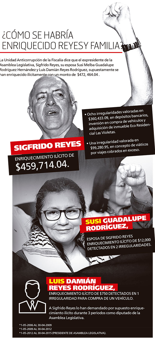 El expresidente de la Asamblea Legislativa, Othon Sigfrido Reyes Morales, su esposa Susi Melba Guadalupe Rodríguez Hernández e hijo, Luis Damián Reyes Rodríguez, fueron demandados por un supuesto enriquecimiento ilícito de $472,464.04.
