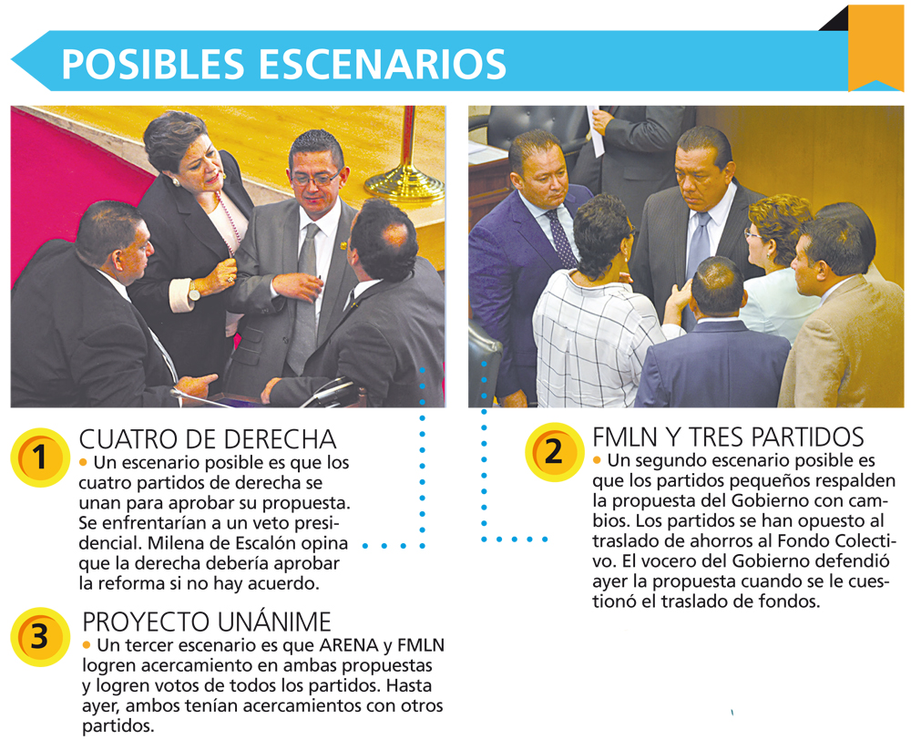 Hasta ayer, ARENA y FMLN se han reunido por separado con los partidos GANA, PCN y PDC. Los diputados de todos los partidos fijan sus esperanzas en que la reforma de pensiones evitará el impago de Certificados de Inversión Previsionales (CIP) que se vencerán a partir del 4 de octubre y que suman $91 millones.