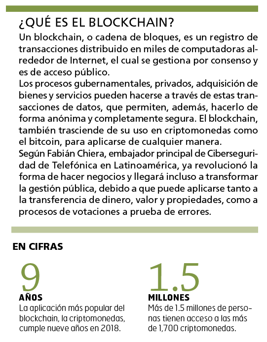 En un futuro más cercano que distante, las “blockchain”, o por traducción al español, cadenas de bloques, comenzarán a reemplazar a los grandes intermediarios de transacciones, “que deben reinventar sus modelos de negocio para unirse a esta revolución”, asegura Fabián Chiera, embajador principal de seguridad de Eleven Paths, división de ciberseguridad de Telefónica.