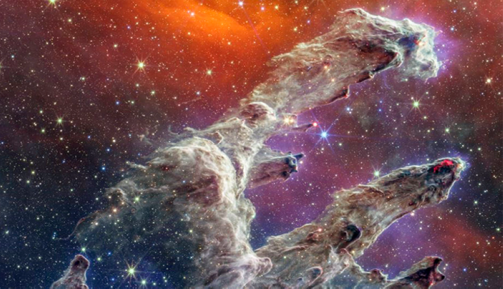 Miríadas de estrellas se extienden por toda la escena. Las estrellas aparecen principalmente en luz infrarroja cercana, lo que marca una contribución de la cámara de infrarrojo cercano de Webb (NIRCam). La luz del infrarrojo cercano también revela miles de estrellas recién formadas: esferas de color naranja brillante que se encuentran justo fuera de los pilares polvorientos.