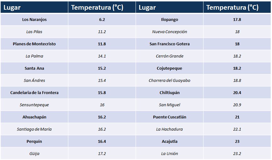 Los Naranjos fue la zona donde más ha descendido la temperatura, durante las últimas horas. Las Pilas, municipio de San Ignacio, Chalatenango, fue otro de los lugares donde las temperaturas redujeron significativamente, alcanzando los 11. 2 °C.