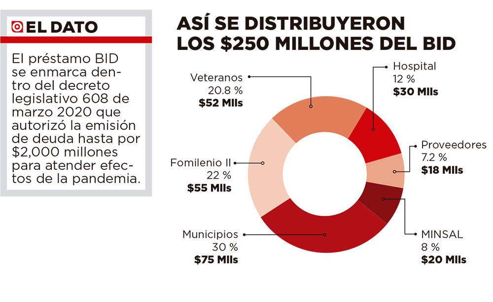 De esta primera asignación, se destinaron $75 millones a las municipalidades del país para el desarrollo de proyectos durante la pandemia, $55 millones para la contrapartida de Fomilenio II, $52 millones para financiar parcialmente el pago de pensiones a veteranos y excombatientes y $15,401,355 para remuneraciones del personal del Hospital El Salvador.