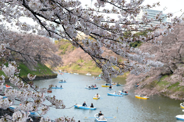 Personas navegan en botes entre árboles de cerezo en el foso Chidorigafuchi en Tokio, Japón. Xinhua