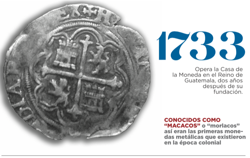 Casi 200 años después, en 1731, se fundó la primera Casa de la Moneda en Guatemala. “Luego de años de trámite ante la Corona Española, finalmente el rey Felipe V autoriza la fundación de la Casa de Moneda de Guatemala mediante Cédula Real del 17 de enero de 1731, empezando la acuñación de monedas en 1733 con la identificación de la ceca de Guatemala ‘G’, que cambió a ‘NG’ con el traslado de la ciudad al valle de la Ermita en 1776. La nueva Casa de Moneda continuó acuñando piezas, con las características de las monedas españolas hasta el fin de la época colonial”, detalla el Banguat.