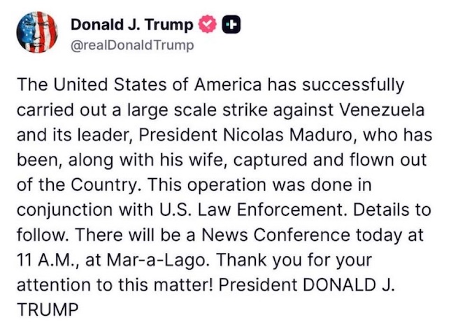 “La operación fue realizada en conjunción con las fuerzas del orden de Estados Unidos”, afirmó Trump en un mensaje publicado en la red social Truth Social, donde adelantó que brindará más detalles en una rueda de prensa a las 11:00 de la mañana, desde Mar-a-Lago, en el estado de Florida.