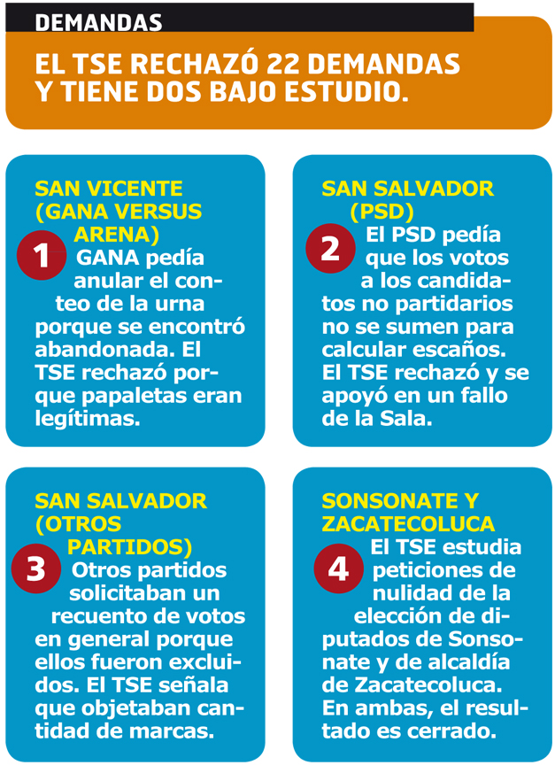 Otras dos resoluciones están bajo estudio: una petición de nulidad de la elección de diputados de Sonsonate y otra contra la elección de la alcaldía de Zacatecoluca, ambas peticiones de ARENA.