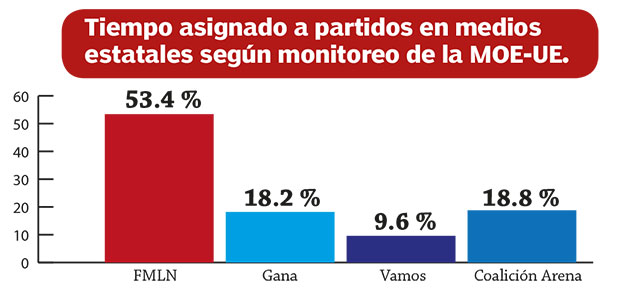 Critican que en medios estatales favorecieron claramente al partido de gobierno con 53 % y 56 % de noticias a favor del candidato del FMLN contra el 18 % o menos a favor de sus contrincantes. De acuerdo a un monitoreo de medios realizado por la misión, hubo polarización de medios y “gran número de páginas web con apariencia de medios digitales difundieron noticias falsas y desarrollaron campañas de difamación”.