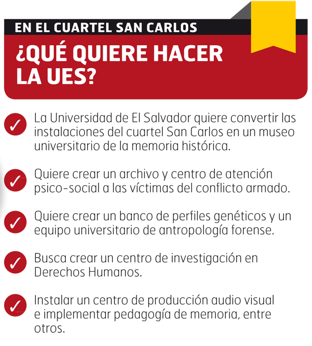 El rector de la Universidad de El Salvador (UES), Roger Arias, pidió ayer al Estado salvadoreño que entregué las instalaciones del cuartel San Carlos (ex primera brigada de Infantería) y la Brigada Especial de Seguridad Militar, para que sean convertidos en un museo universitario de la memoria histórica para estudiantes de dicha Alma Máter.