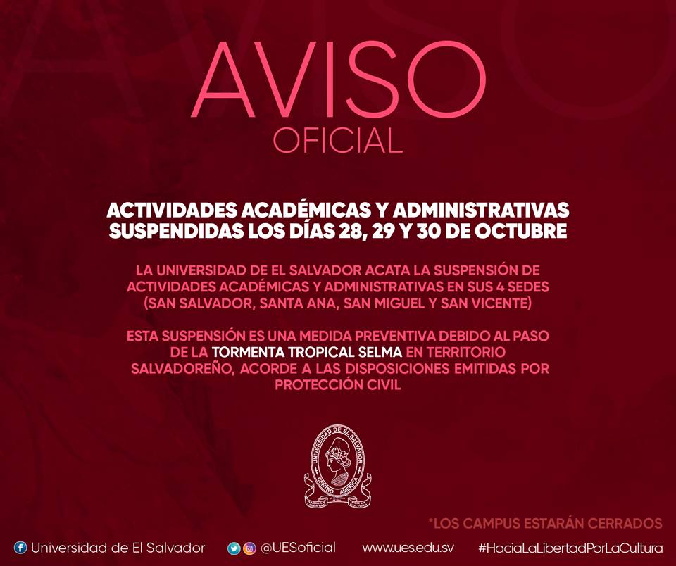 Debido a las alertas emitidas por las autoridades de Protección Civil ante la llegada de la tormenta tropical Selma, la rectoría de la Universidad de El Salvador (UES) confirmó que esta institución de educación superior suspenderá sus actividades "académicas y administrativas" los días 20, 29 y 30 de octubre.