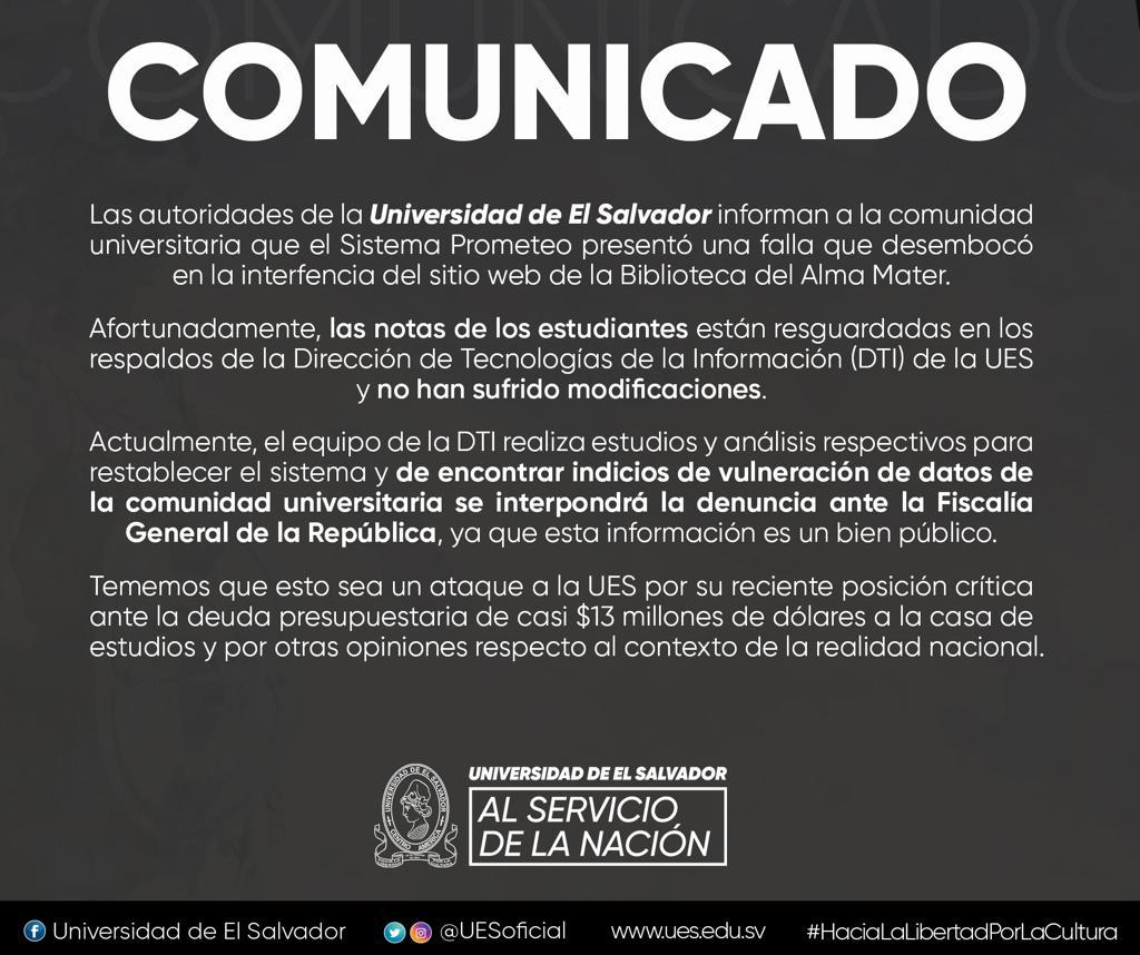 La Universidad de El Salvador (UES) afirmó este domingo que temen que el hackeo en el sitio web de la institución se deba a represalias por solicitar que se deposite más de $12.9 millones que el Ministerio de Hacienda les adeuda.