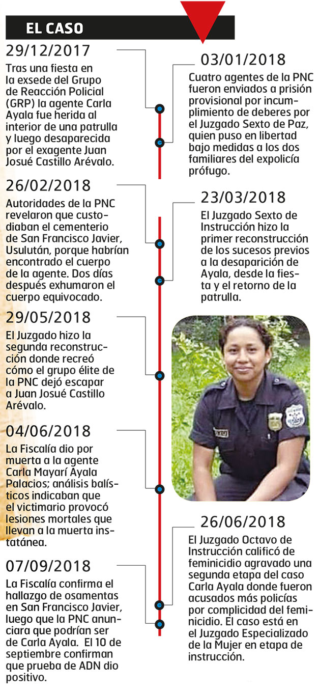Carla Ayala fue desaparecida después de una fiesta de fin de año del extinto Grupo de Reacción Policial (GRP), la historia contada por los dos policías que la llevaban a su casa es que el prófujo “Samurái”, le disparó al interior de la patrulla, mientras se conducían en el bulevar Constitución, en las cercanías de la residencial La Gloria, en San Salvador.