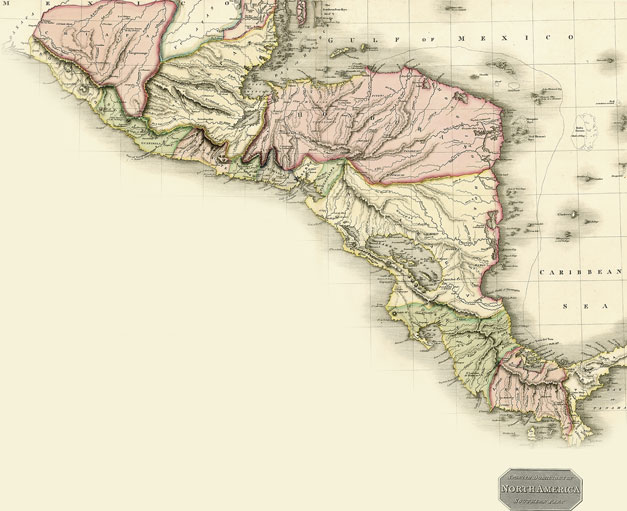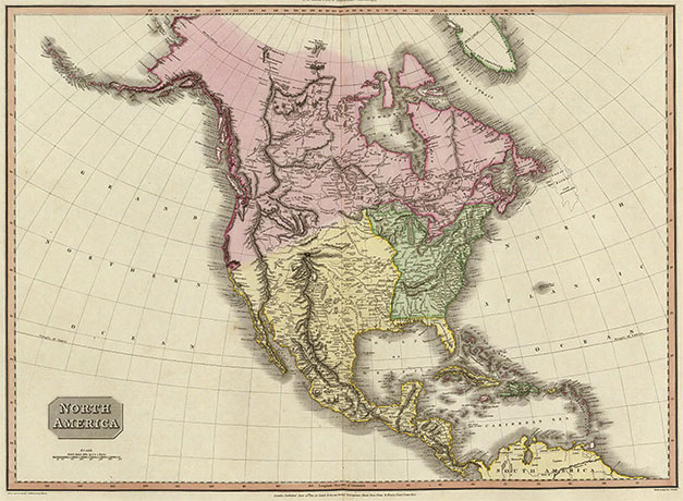 MAPA DE JOHN PINKERTON, publicado en Londres, en 1815. En color rosa se destacan las posesiones territoriales de los Estados Unidos, en rosa las británicas en Canadá y otras áreas al norte continental y en amarillo las del Virreinato de la Nueva España, que incluyen al Reino de Guatemala. Imagen procedente de una colección privada.